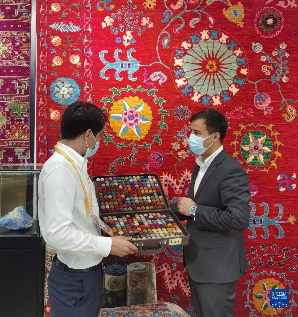 阿富汗参展商阿里·法伊兹(右)在第四届中国国际进口博览会阿富汗手工羊毛地毯展台忙碌(2021年11月5日摄)。新华社记者 吴宇 摄
