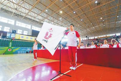 7月12日,运动员代表曹茂园(右)在成立大会上宣誓。 新华社记者 颜麟蕴 摄