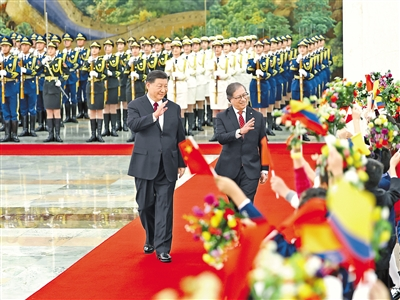 会谈前,习近平在人民大会堂北大厅为佩特罗举行欢迎仪式。