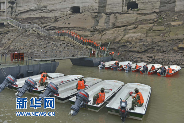 6月2日,重庆武警舰艇支队集结待命。重庆武警舰艇支队启动抢险预案,正在万州某水域进行水上蛙人救援训练的该部潜水分队连夜做好出动救援的各项准备,随时等待命令出动救援。新华社发