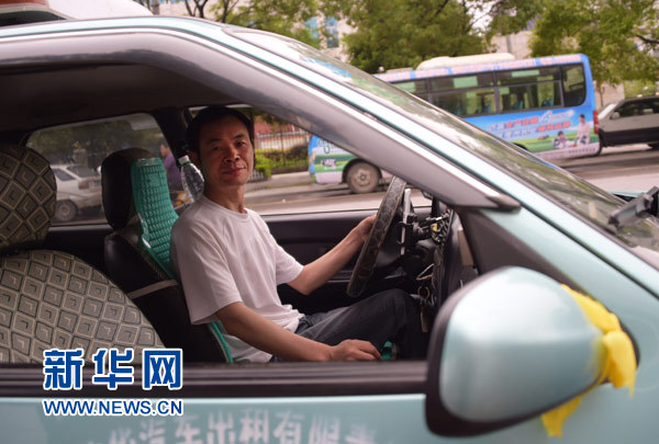 6月4日,出租车司机熊自贵在车上系上黄丝带。客船翻沉事故发生后,湖北监利越来越多的出租车和私家车绑上黄丝带,加入到免费为家属、救援人员服务的行列。 新华社记者 程敏 摄