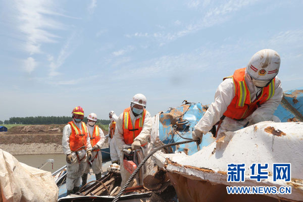 6月6日,湖北省消防官兵在破拆“东方之星”船体。新华社发
