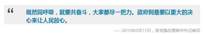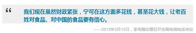 2013年3月17日,李克强总理在人民大会堂会见中外记者,并回答记者提问。有记者问,中国食品安全问题日益严重,中国政府将如何解决?总理说,食品安全,那可以说是天大的事,直接关系到人们的生活质量和身体健康。政府应该对假冒伪劣和黑心食品坚决进行查处,并且让不法分子付出昂贵的代价。总理还表示,不论是污染状况、食品问题,还是治理和处置的效果,都要公开透明,让公众、媒体能够充分有效地加以监督,“这也是形成一种倒逼机制,来硬化企业和政府的责任,也可以增强人们自身的防护意识”。他号召,“既然同呼吸,就要共奋斗,大家都尽一把力。政府则是要以更大的决心来让人民放心。”