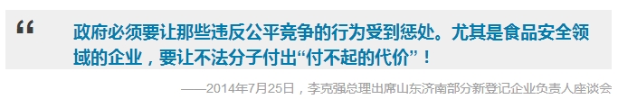2014年7月25日,国务院总理李克强在山东济南召开部分新登记企业负责人座谈会。在会上,李克强说,政府要严格监管,创造公平竞争的环境,让企业在竞争中公平、健康发展。“如果谁违反规则却没有受到应有的惩罚,这就打击了那些诚信守法、注重质量、讲求效益的企业,就会造成‘劣币驱逐良币’。因此,政府必须要让那些违反公平竞争的行为受到惩处。尤其是食品安全领域的企业,要让不法分子付出‘付不起的代价’!”李克强斩钉截铁说道。