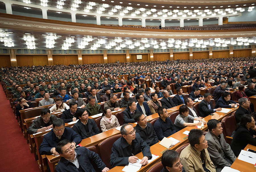 中央宣传部、中央直属机关工委、中央国家机关工委、教育部、中央军委政治工作部、中共北京市委在北京人民大会堂举办学习贯彻党的十九大精神中央宣讲团首场报告会(11月3日摄)。新华社记者 丁海涛 摄