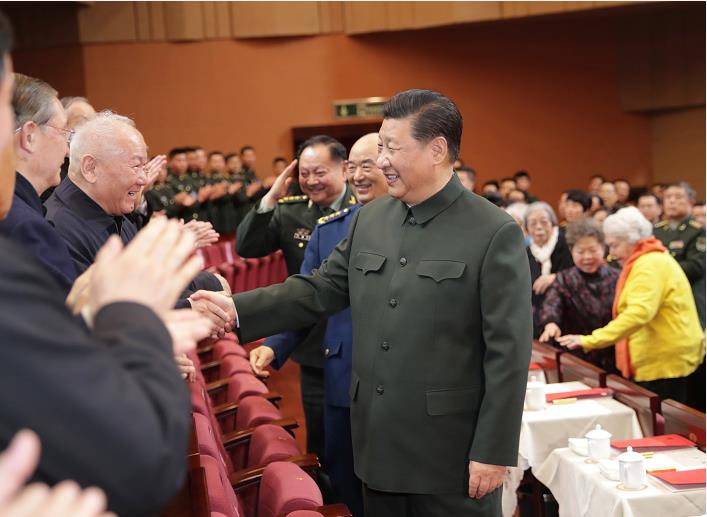 下午3时30分许,习近平来到老同志中间,全场响起热烈掌声。习近平同大家亲切握手,关切询问他们的身体和生活情况,共同回顾在党的十九大精神指引下,过去一年来党、国家和军队事业展现的新气象、开创的新局面、取得的新成就。老同志们一致表示要更加紧密地团结在以习近平同志为核心的党中央周围,坚持以习近平新时代中国特色社会主义思想为指导,深入贯彻习近平强军思想,深入贯彻新时代军事战略方针,锐意进取,埋头苦干,以优异成绩迎接新中国成立70周年。