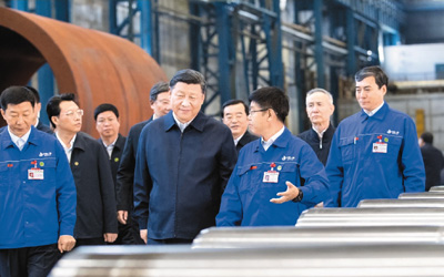 二〇一八年九月二十五日至二十八日,中共中央总书记、国家主席、中央军委主席习近平在东北三省考察,主持召开深入推进东北振兴座谈会。图为二十六日上午,习近平在黑龙江齐齐哈尔中国一重集团有限公司车间察看企业生产情况。