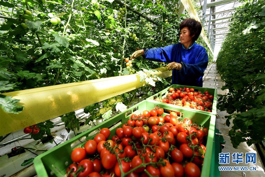 5月25日,工人在河北省南和县贾宋镇一家现代农业园区采摘西红柿。新华社记者朱旭东摄