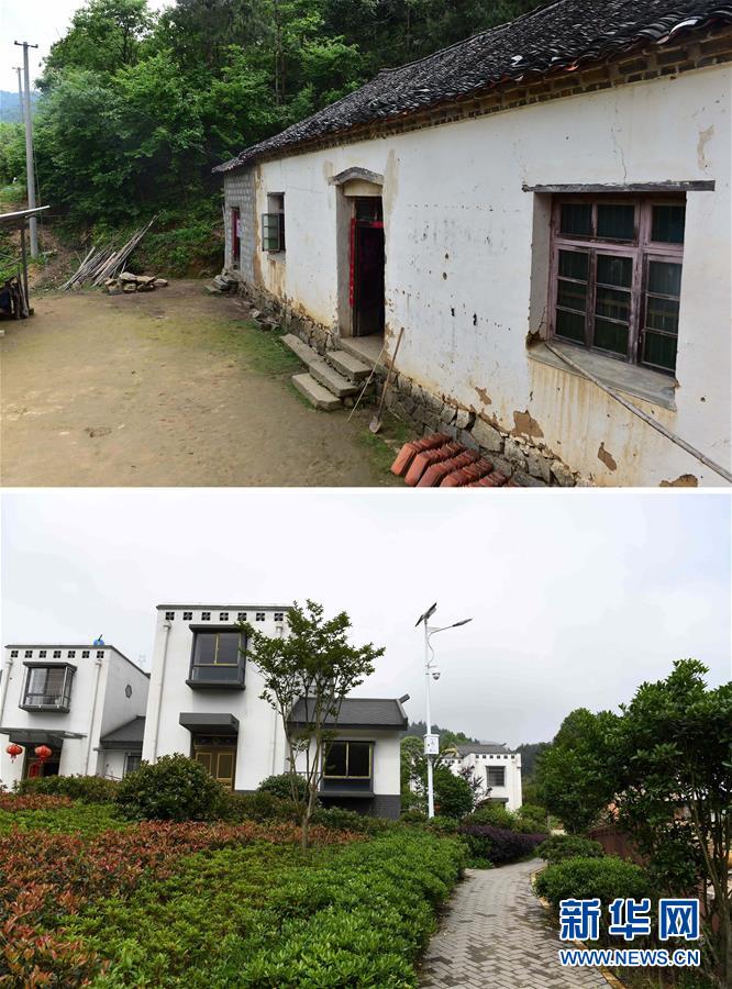 拼版照片:上图为安徽省金寨县花石乡大湾村村民的住房(2016年4月25日摄);下图为大湾村易地扶贫安置点的村民住房(2019年5月18日摄)。新华社记者刘军喜摄