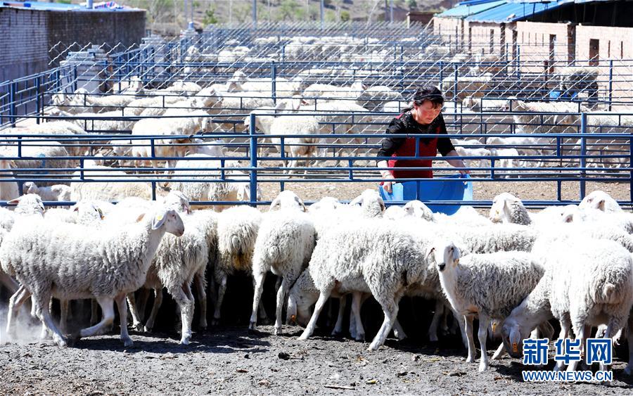 陕西省延安市安塞区化子坪镇河西沟湖羊养殖场的工作人员在喂羊(4月23日摄)。 新华社记者 刘潇 摄