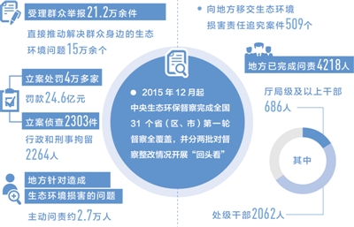 受理群众举报21.2万余件,直接推动解决群众身边的生态环境问题15万余个;立案处罚4万多家,罚款24.6亿元;立案侦查2303件,行政和刑事拘留2264人;地方针对造成生态环境损害的问题,主动问责约2.7万人。这是第一轮督察及“回头看”的有关数据,生态环保“钦差”业绩不一般,共向地方移交生态环境损害责任追究案件509个,地方已完成问责4218人,其中厅局级及以上干部686人、处级干部2062人。