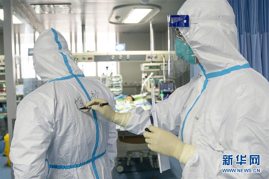 1月24日,在武汉大学中南医院重症隔离病房,医护人员在隔离服上写下名字,方便辨认。新华社记者 熊琦 摄