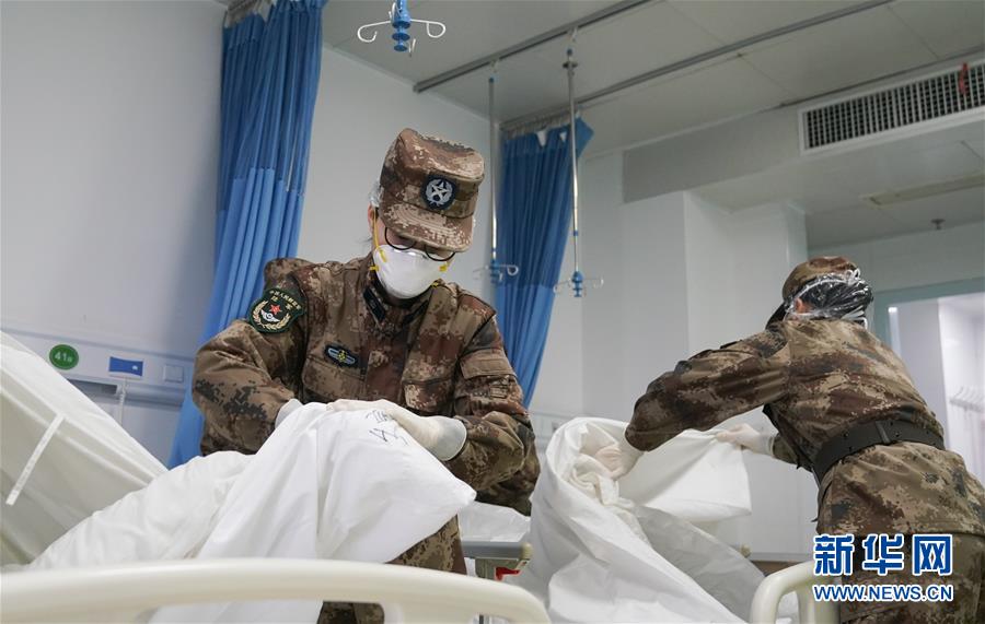 1月26日,陆军军医大学医疗队队员在武汉市金银潭医院接管病区清理病房,准备迎接患者入院。新华社记者 熊琦 摄