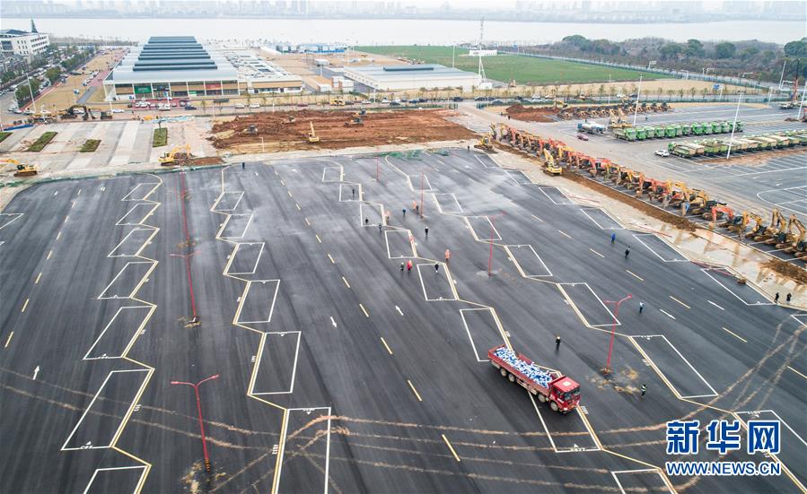 1月26日,在武汉雷神山医院建设工地,大型机械加紧施工(无人机照片)。新华社记者 肖艺九 摄
