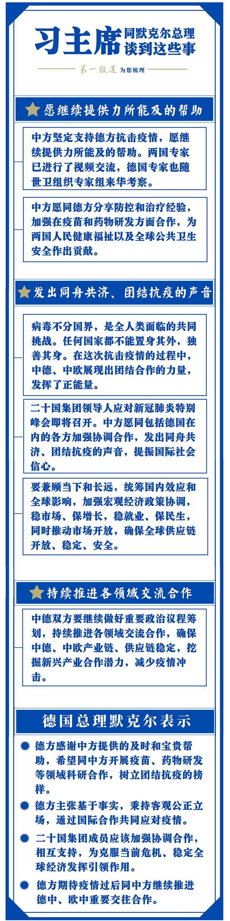习近平强调,在中国发生新冠肺炎疫情初期,你向中方表达了慰问和支持,德国政府和各界纷纷伸出援手,中国人民铭记在心。目前德国面临疫情严峻挑战,中国人民感同身受。中方坚定支持德方抗击疫情,愿继续提供力所能及的帮助。两国专家已进行了视频交流,德国专家也随世卫组织专家组来华考察。中方愿同德方分享防控和治疗经验,加强在疫苗和药物研发方面合作,为两国人民健康福祉以及全球公共卫生安全作出贡献。祝愿你领导德国人民早日克服疫情!