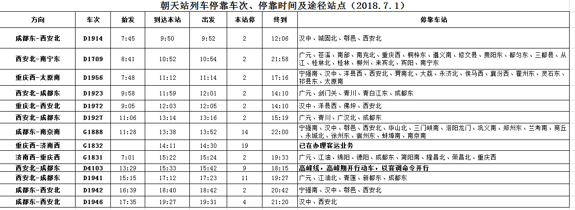 朝天站列车停靠车次、停靠时间及途径站点(2018.7.1)