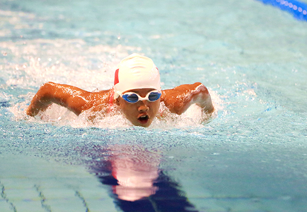 15日晚,广元选手魏思宇参加女子丙组100米蝶泳决赛。