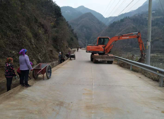 在朝阳路大滩镇茅坪村段,民工们正配合挖掘机迎雪施工,忙着砍割道旁柴草、清理旁沟、推运土石等。