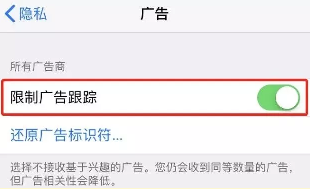 苹果手机提供了“限制广告跟踪”功能,其实是通过重置、还原广告标识符的方式,来切断用户画像和对应设备的联系。重置后,用户收到广告的数量不会有变化,只是个性化广告关联度、精准度会降低。