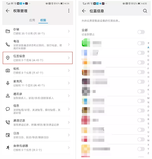 点击【设置-应用-权限管理-权限-以位置信息为例 一键关闭全部应用位置权限】。