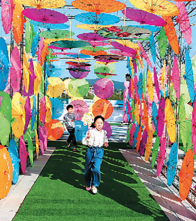 油纸伞文化节引来儿童开心观赏。 刘贵雄摄(人民图片)