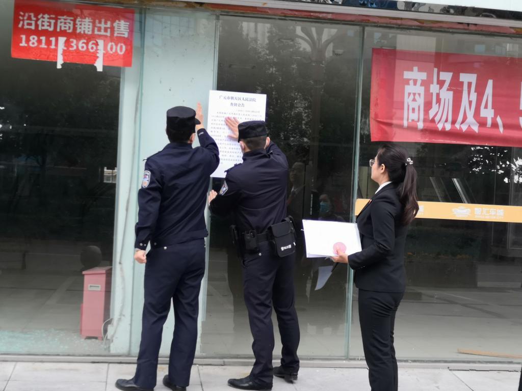 在利州区某商业城,由于某公司欠银行借款1.12亿元未还,在执行过程中,区法院查明被执行人某公司名下有位于广元市利州区某商业城面积为19347.46平方米的不动产,便于第一时间制作执行裁定书,将该公司名下的3处房产进行了查封,并在现场张贴了查封公告。