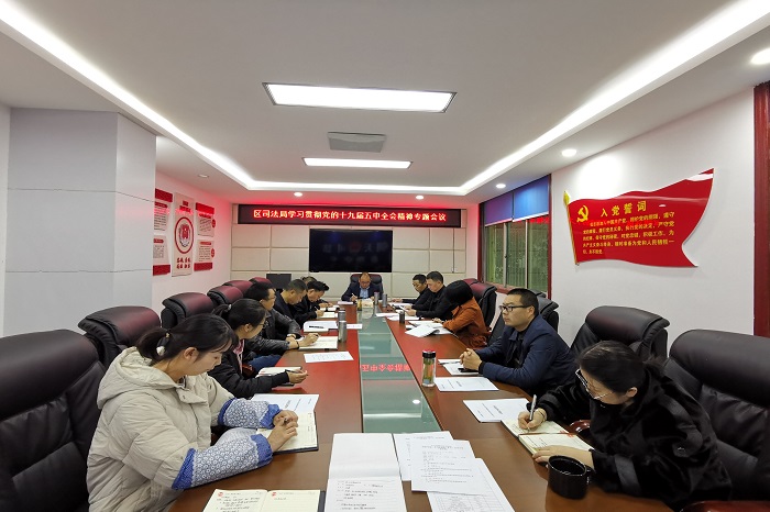 11月17日下午,区司法局召开党组(扩大)会议,学习贯彻党的十九届五中全会精神。区司法局党组成员及全体中层党员干部在司法局参会。