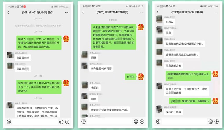案件受理后,执行干警迅速对黄某某采取冻结银行账户、限制高消费等强制执行措施。意识到强制执行的负面影响后,被执行人黄某某主动与执行干警联系,表示愿意协商解决纠纷,请求执行和解。执行干警遂与申请人取得联系,申请人表示同意与对方协商处理,但由于疫情影响,加之人在外地,不便于到法院处理案件。经过双方当事人同意,执行干警决定采用手机微信群的方式组织双方协商,经过一番线上和解工作,双方当事人成功达成执行和解协议,该起纠纷得以成功化解。